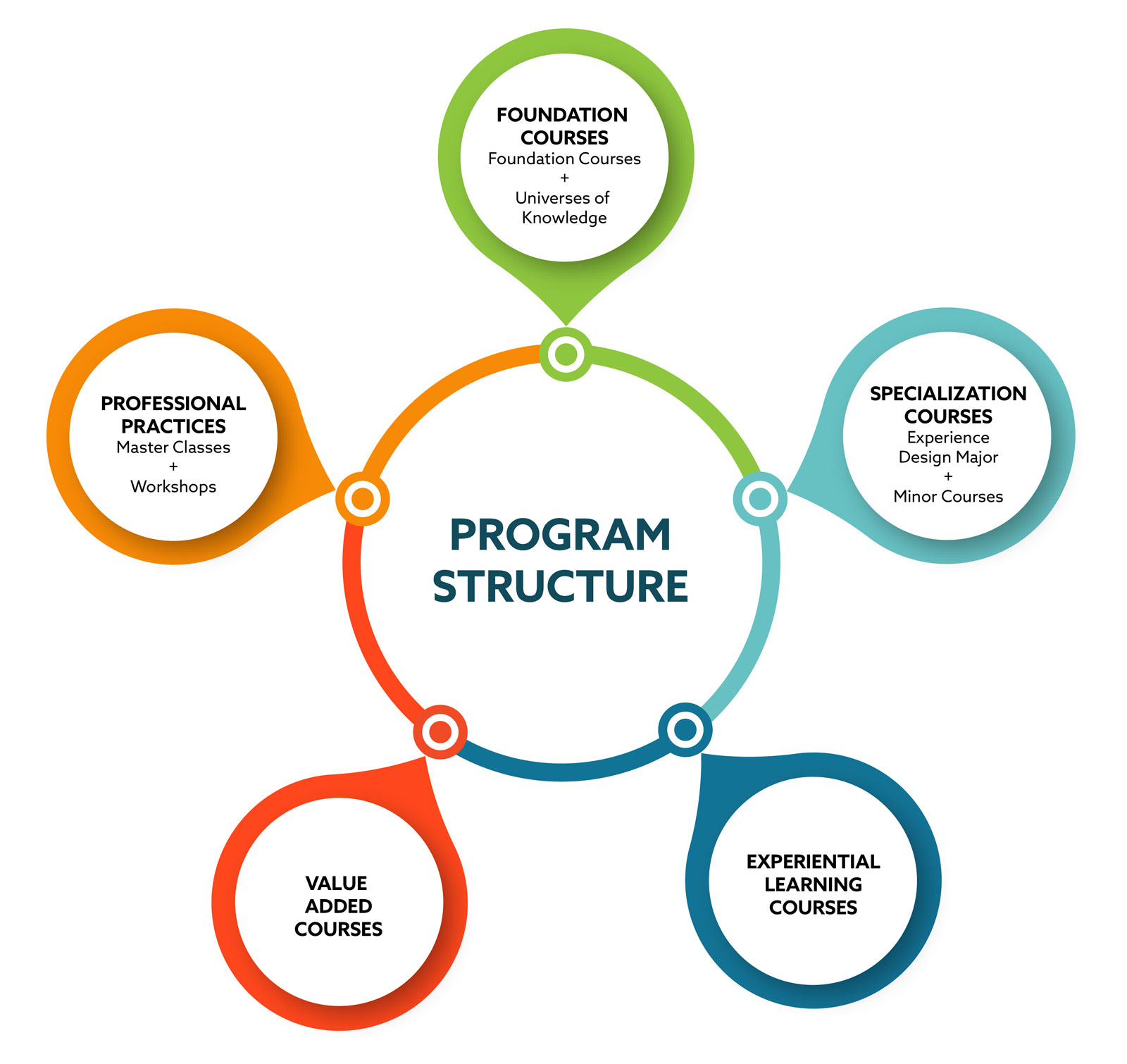 FLAME University's B.Des undergraduate program comprises Foundation Courses, Specialization Courses, Experiential Learning Courses, Value-Added Courses, and Professional Practices.