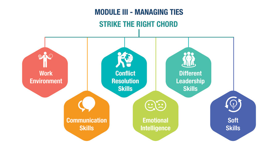 This module covers interpersonal and communication skills, teamwork, advocacy skills, leadership and emotional intelligence at work. These skills help to plan and execute tasks effectively along with co-workers, bosses, subordinates and others. It teaches them conflict resolution to promote ownership and accomplishment. It familiarizes students with various leadership styles. In a world where soft skills of handling people are as important as technical skills, this module is essential for students. Managing emotions and expectations are a huge part of management.