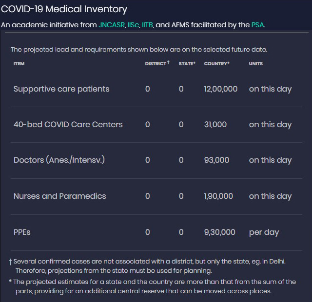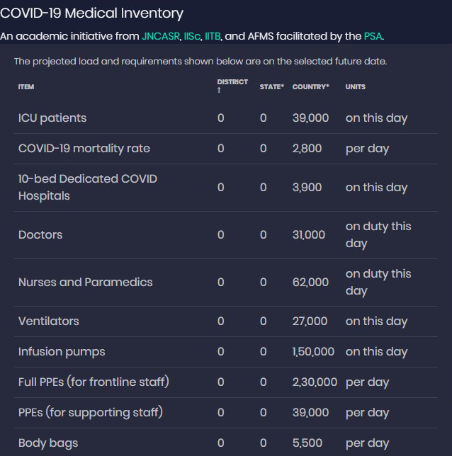 In the meantime Jawaharlal Nehru Centre for Advanced Scientific Research, Indian Institute of Sciences, Indian Institute of Management Bangalore and Armed Forces Medical Services facilitated by the Office of Principal Scientific Office, Government of India recently established a web portal that provides a four-week projected requirement for various medical inventory across districts, states, and the national level.