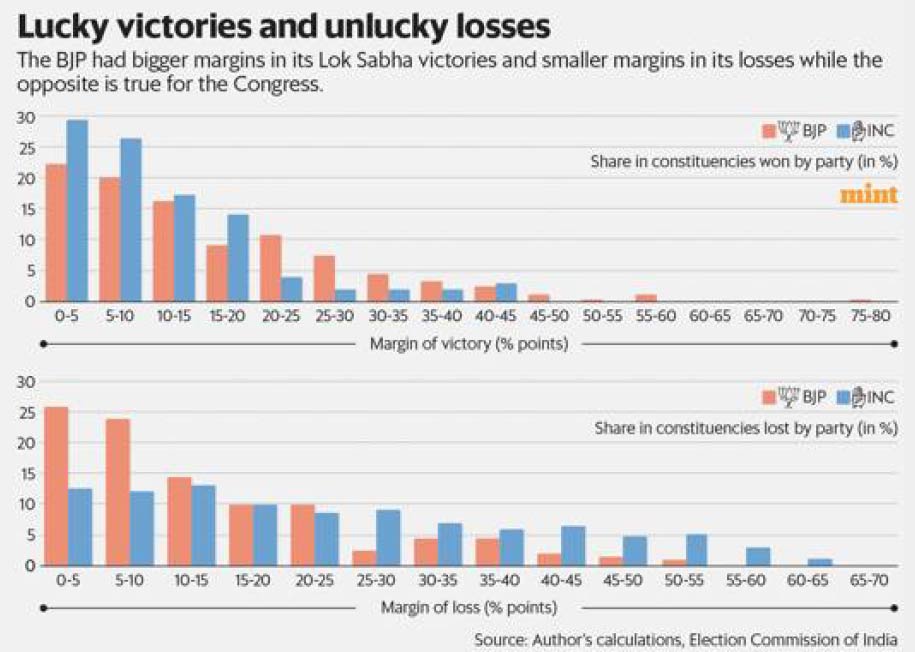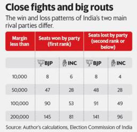 We excavate a very simple metric; in addition to winning margins, we also look at losing margins at the constituency-level to compare the Bharatiya Janata Party (BJP) with the Indian National Congress