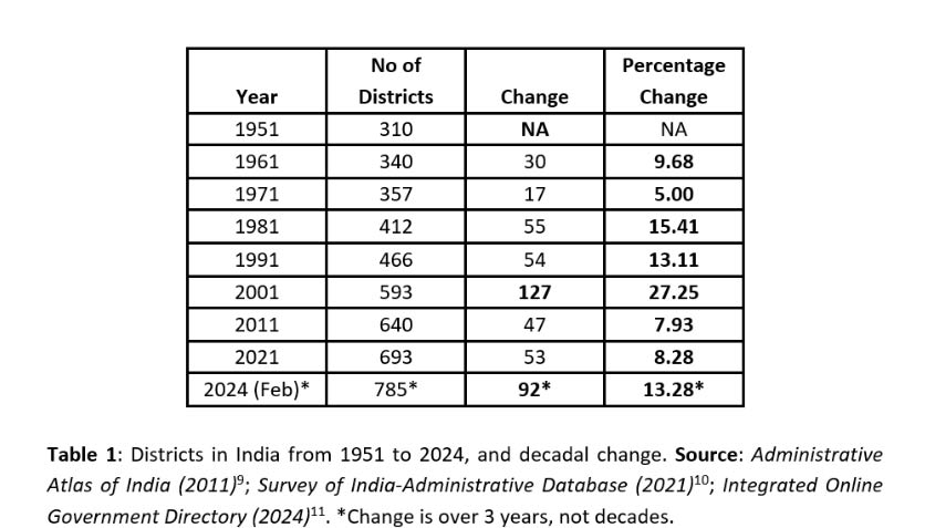 Between 1951 to 2024, India’s population has increased close to 4 fold (361 million to 1400 million), while the average district population has indeed increased only 2.2 fold from 1.16 million to 1.78 million, thereby justifying the creation of a large number of new districts in recent times.