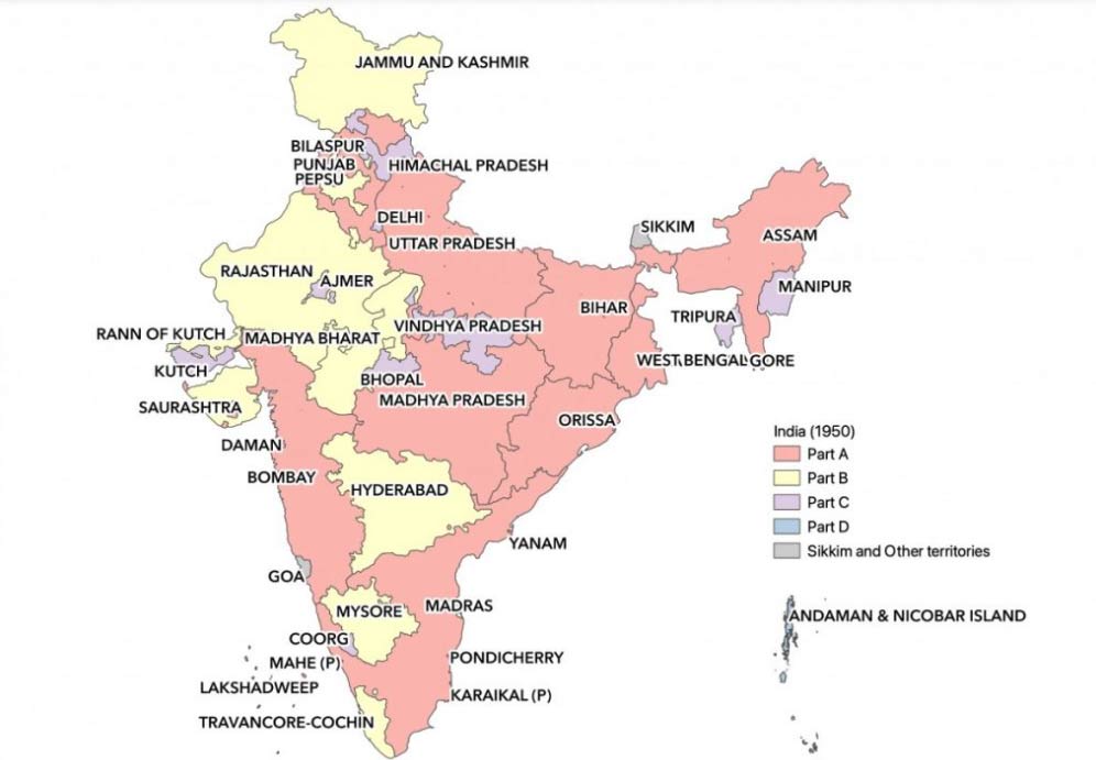 By 1951, efforts undertaken by the Indian government to consolidate these units resulted in 310 districts across 29 states (classified as Part A, B, C, and D). In 1956, administrative divisions in the country were linguistically re-organised as per the recommendations of the State Reorganisation Commission (SRC). The map formed thereafter can be called the foundational map for states of India.