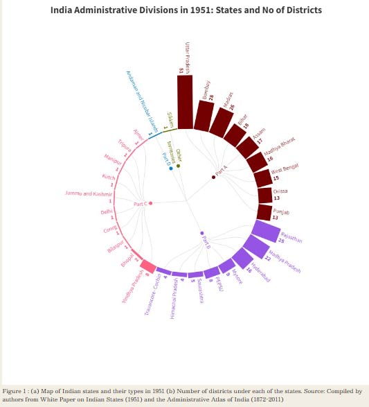 Figure 1 : (a) Map of Indian states and their types in 1951 (b) Number of districts under each of the states. Source: Compiled by authors from White Paper on Indian States (1951) and the Administrative Atlas of India (1872-2011)