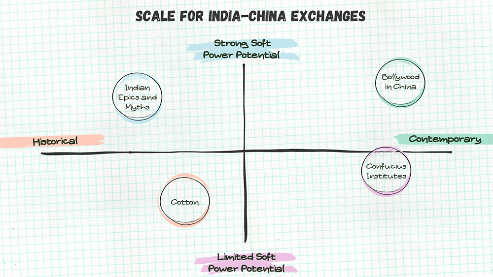 To communicate the breadth and strength of cultural contacts characterizing India-China relations, we have constructed a simple scale that represents time and soft power potential. The Index has two scales, one (X-axis) to measure the historical or contemporary nature of the intermediary, and the other (Y-axis) to measure its limited or strong soft power potential. The objects, people and ideas in this project have been presented in reference to their position on these axes, offering a single-window guide for understanding the landscape of the modern bridges and resonant connections in India-China cultural relations. For instance, some intermediaries have existed only in the contemporary period, like Confucius Institutes or Bollywood, but have fairly strong soft power potential. On the other hand, cotton has a historical relevance in India-China relations, but very limited soft power potential.