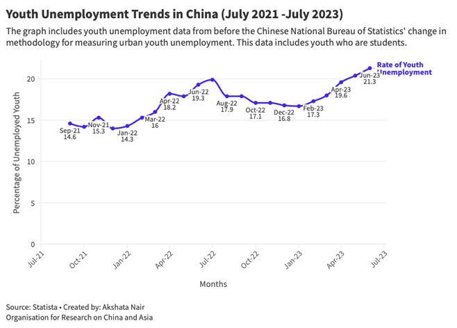 China’s rising levels of youth unemployment is rapidly turning into a large-scale crisis. This has warranted extensive action by the Communist Party of China (CPC), including an overhaul of policy measures and selective reporting. In June 2023, the National Bureau of Statistics of China stooped releasing regular reports of unemployment which had reached a record high of nearly 21.3 percent. This is in stark contrast with rates from October 2023, when the youth unemployment rate was approximately 18 percent. About a year previous to this, in November 2022, the youth unemployment rate was 16.7 percent. The graph below shows the rapidity with which youth unemployment is growing in China.