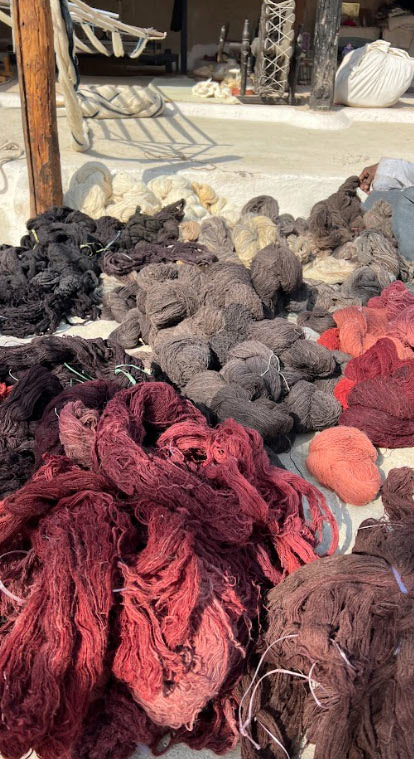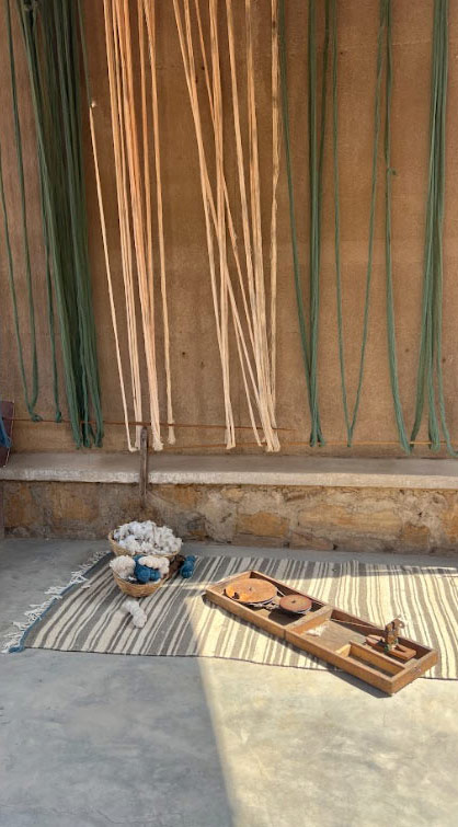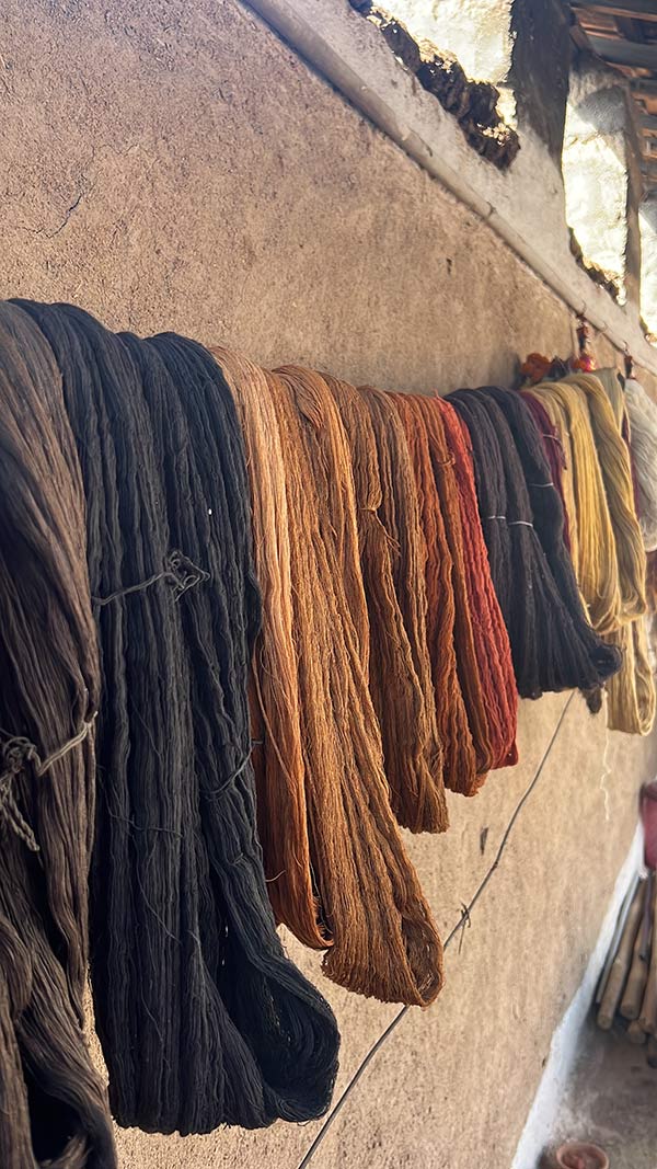 The journey of creation begins with sourcing materials, with cotton, wool, and silk sourced mainly from Ludhiana and other parts of Gujarat. These raw materials undergo meticulous processing, from combing and carding to spinning into yarn using the charkha. The dyeing process is a spectacle in itself, with natural dyes like rhubarb, babool, acai tree, lac, turmeric, beet, and onion peels infusing each thread with rich hues of convention. Only indigo stands as a reminder of modernity, dyed chemically for its distinctive shade.